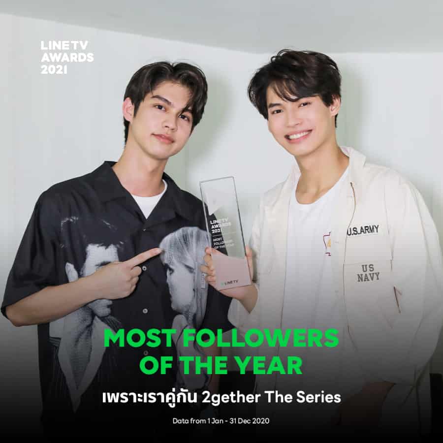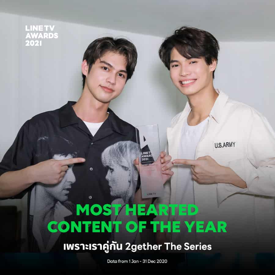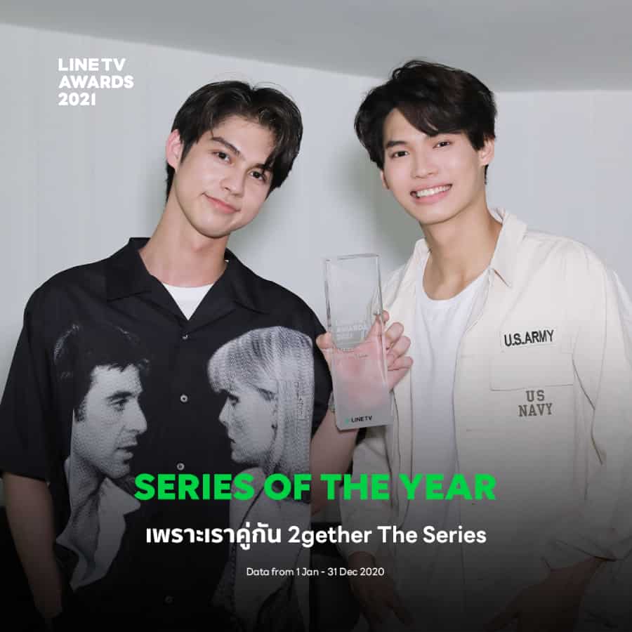 และอีกหนึ่งผลงานที่โดดเด่นไม่แพ้กันก็คือ ซีรีส์ “เพราะเราคู่กัน 2gether the Series” จากค่ายจีเอ็มเอ็มทีวีนำแสดงโดย ไบร์ท-วชิรวิชญ์ ชีวอารี และ วิน-เมธวิน โอภาสเอี่ยมขจร ที่คว้าไปถึง 4 รางวัล ได้แก่ SERIES OF THE YEAR ซีรีส์ที่มียอดเข้าชมสูงสุด, LINE TV BEST RISING STAR รางวัลดาวรุ่งยอดนิยม วิน เมธวิน หรือไทน์, MOST FOLLOWERS OF THE YEAR คอนเทนต์ที่มีการกดติดดาวสูงสุด, และ MOST HEARTED CONTENT OF THE YEAR คอนเทนต์ที่มีการกดหัวใจสูงสุด