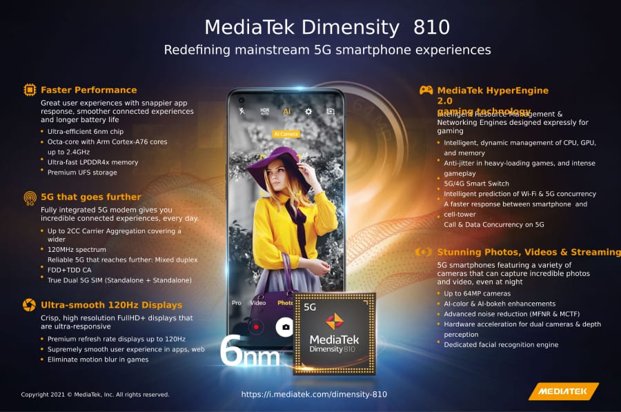 Dimensity 810 ผลิตด้วยกระบวนการโหนดอุตสาหกรรมประสิทธิภาพสูง 6nm และยังมี Arm Cortex-A76 CPU ความเร็วสูงสุดถึง 2.4GHz รวมถึงคุณสมบัติของกล้องระดับพรีเมียมต่าง ๆ เช่น เทคโนโลยี AI-color สร้างสีสันน่าตื่นตาที่ได้ร่วมคิดค้นกับทางบริษัท Arcsoft และเทคโนโลยีลดนอยส์ขั้นสูงที่ใช้ถ่ายภาพในสภาวะแสงต่ำมาก