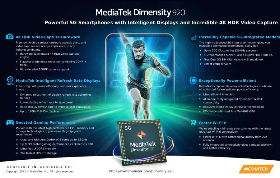 Dimensity 920 ซึ่งออกแบบมาเพื่อใช้กับสมาร์ทโฟน 5G พลังสูงนั้นผสานศักยภาพ ความแรง และราคาได้อย่างลงตัว ผู้ใช้จึงสามารถเพลิดเพลินไปกับประสบการณ์การใช้มือถืออันน่าตื่นตา อีกทั้งชิปเซ็ตรุ่นนี้ผลิตด้วยกระบวนการโหนดอุตสาหกรรมประสิทธิภาพสูง 6nm และยังรองรับการแสดงผลหน้าจออัจฉริยะและการจับภาพวีดิโอ HDR ระดับ 4K พร้อมทั้งเพิ่มศักยภาพในการเล่นเกมมิ่งได้สูงขึ้น 9% เมื่อเทียบกับ Dimensity 900 รุ่นก่อน