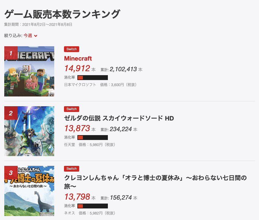 โดยปกติในทุกสัปดาห์ ทาง Famitsu ซึ่งเป็นสื่อใหญ่ด้านเกมของญี่ปุ่น จะมีชาร์ตแสดงอันดับ เกมขายดี ในแต่ละสัปดาห์มานำเสนอ ความน่าทึ่งก็คือในช่วงต้นเดือนสิงหาคมที่ผ่านมา ในชาร์ต Top 30 นั้น เป็นเกมจากเครื่อง Nintendo Switch