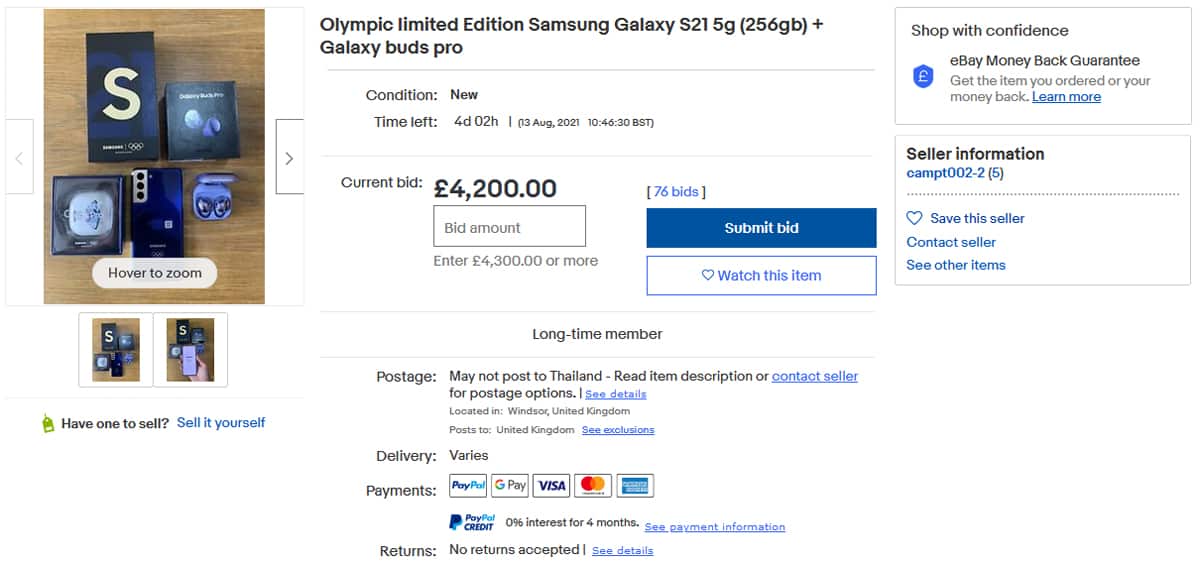 Taylor Campbell นักกีฬาขว้างค้อนชายของทีมสหราชอาณาจักรได้นำสมาร์ทโฟน Samsung Galaxy S21 รุ่น Olympic limited edition 256GB พร้อม Galaxy Buds Pro และ เคส Galaxy Buds Pro Olympic limited edition มาเปิดประมูลในเว็บไซต์ eBay เพื่อหาทุนไปแข่งขันรายการต่อไป