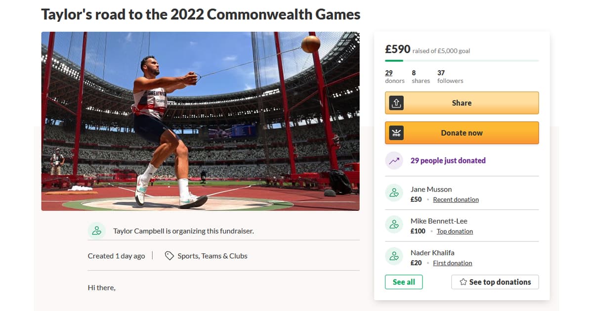 นอกจากจะเปิดประมูลสมาร์ทโฟนรุ่นพิเศษเพื่อหาทุนสำหรับการแข่งขัน เขายังเปิดแคมเปญไว้ในเว็บไซต์ gofundme โดยมีแคมเปญที่ชื่อว่า ” Taylor’s road to the 2022 Commonwealth Games ” ล่าสุดมียอดโดเนทรวมอยู่ที่ 590 ปอนด์ โดยมีการตั้งเป้าการโดเนทเอาไว้ที่ 5,000 ปอนด์ หรือประมาณ 232,000 บาท
