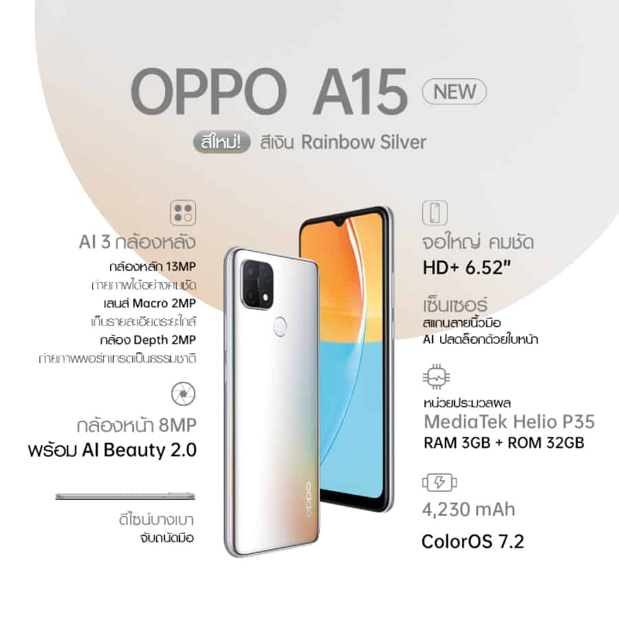 OPPO A15 NEW สีใหม่! Rainbow Silver ราคา 4,699 บาท วางขาย 20 สค. นี้