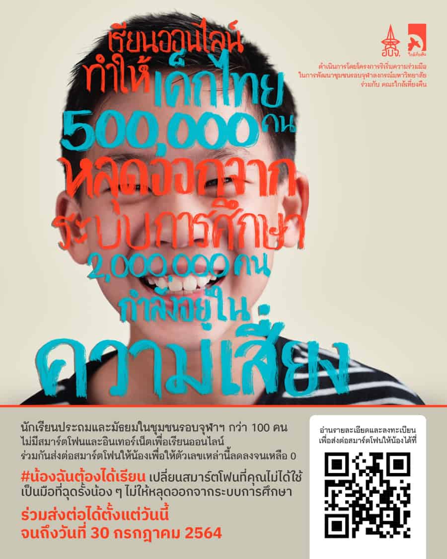 ในวิกฤตโควิด-19 นั้น หลายครอบครัวกำลังเผชิญปัญหาด้านเศรษฐกิจ ทั้งการตกงาน การได้รับรายได้ลดลง หรือธุรกิจที่ต้องหยุดชะงักจากคำสั่งปิดกิจการที่มีความเสี่ยงต่อการแพร่ระบาดโควิด-19 จนทำให้เกิดภาวะ “จนเฉียบพลัน” ซึ่งส่งผลกระทบโดยตรงกับครอบครัวที่มีลูกหลานที่กำลังเรียนหนังสือแบบออนไลน์ เนื่องจากค่าใช้จ่ายในส่วนของอุปกรณ์สมาร์ทโฟนและอื่นๆ ที่เกี่ยวข้อง รวมถึงค่าอินเทอร์เน็ตที่อาจไม่มีกำลังมากพอในการเข้าถึงการเรียนในรูปแบบใหม่นี้ จึงทำให้ปัจจุบันมีเด็กนักเรียนหลุดจากระบบการศึกษาไปแล้วกว่า 500,000 คน และภายในสิ้นปี 2564 นี้ คาดว่าจะมีนักเรียนที่ต้องหลุดออกจากระบบการศึกษาอีก 65,000 คน รวมถึงมีเด็กนักเรียนที่เสี่ยงหลุดออกจากระบบการศึกษาอีก 2 ล้านคนจากวิกฤตในครั้งนี้อีกด้วย