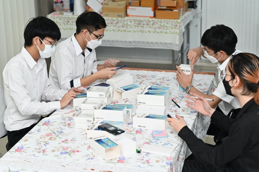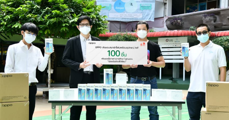 สำหรับสมาร์ทโฟนที่ออปโป้ร่วมส่งมอบนั้นเป็นรุ่น OPPO A54 รวมถึงอุปกรณ์ IoT หูฟังไร้สาย OPPO Enco Buds ให้น้องๆ ได้เรียนและโต้ตอบกับคุณครูด้วยคุณภาพเสียงที่คมชัดและตัดเสียงรบกวนได้เป็นอย่างดี ใช้งานได้ยาวนานถึง 24 ชั่วโมงซึ่งครอบคลุมการเรียนของน้องๆ “ออปโป้หวังเป็นอย่างยิ่งว่าการร่วมมือกันในครั้งนี้ จะเป็นประโยชน์อย่างยิ่งแก่น้องๆ และขอเชิญชวนพี่ๆ น้องๆ คนไทยร่วมกันส่งมอบสมาร์ทโฟนที่ท่านไม่ได้ใช้งานแล้วแต่ยังอยู่ในสภาพดี เพื่อช่วยมอบอนาคตทางการศึกษาแก่น้องๆ นักเรียน เพราะการศึกษาคือรากฐานสำคัญของการพัฒนาของมนุษย์และสังคม” คุณชานนท์กล่าวเสริม