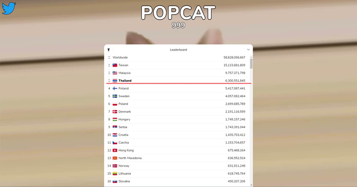 ยิ่งไปกว่านั้น ดูเหมือนมันจะกลายเป็นวาระระดับชาติ เมื่อมีเพจ Facebook ต่างๆ เชิญชวนให้คนไทยเข้าไปปั๊มยอดคลิกบนเว็บไซต์ POPCAT ซึ่งภายในเกมจะมีการแสดงยอมคลิกจากประเทศต่างๆ ว่าประเทศไหนที่มีคะแนนสูงที่สุดในโลก