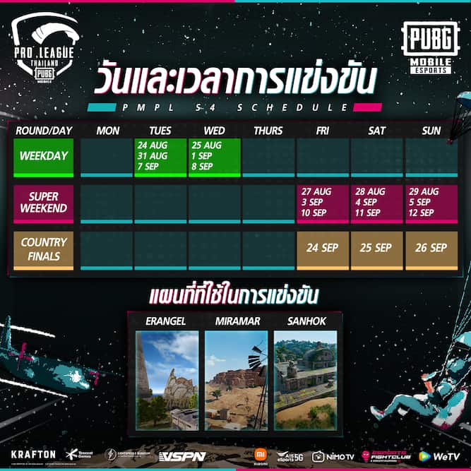 PUBG MOBILE PRO LEAGUE THAILAND SEASON 4 จะเริ่มขึ้นวันที่ 24 สิงหาคม และจะมีไปจนถึงวันที่ 12 กันยายนนี้ การแข่งขันใช้เวลา 15 วัน และมีรูปแบบที่แตกต่างจากซีซั่นที่แล้ว นั่นคือ การแข่งขันในวันธรรมดา หรือ Weekday จะมีขึ้นทุกวันอังคารและวันพุธ ส่วนการแข่งขัน Super Weekends จะเริ่มตั้งแต่วันศุกร์ถึงวันอาทิตย์ นอกจากนี้จะมีการจับฉลากสุ่มสายการแข่งขันในวันที่ 14 สิงหาคม 2564 นี้อีกด้วย