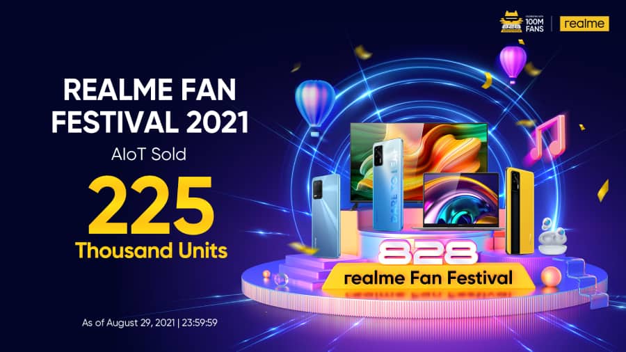 realme แท็กทีมแฟนๆ ทั่วโลก ร่วมฉลองพลังของคนรุ่นใหม่ ปิดยอดขายรวม 330 ล้านดอลลาร์ในช่วงเทศกาล realme Fan Festival 2021 เติบโตถึง 38% เมื่อเทียบกับปีที่ผ่านมา แบ่งเป็น ยอดขายสมาร์ทโฟน 1.6 ล้านเครื่อง และอุปกรณ์ AIoT 225,000 เครื่อง