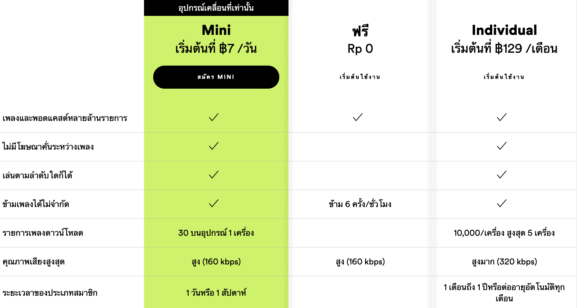 Spotify เปิดตัวแพ็กเกจใหม่ Premium Mini เพื่อให้ผู้ใช้ชาวไทยเข้าถึงแพลตฟอร์มสตรีมมิ่งคอนเทนต์เสียงที่ใหญ่ที่สุดในโลกแพ็คเกจขนาดกะทัดรัดนี้มอบความยืดหยุ่นที่เหมาะสมกับลักษณะนิสัยการฟังเพลงของแต่ละบุคคล ด้วยการสมัครใช้งานแบบรายวันและรายสัปดาห์ เพียง 7 บาท ต่อวัน และ 26 บาท ต่อสัปดาห์