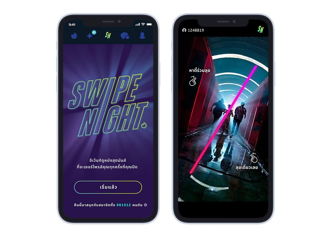 ทินเดอร์ได้เปิดตัวกิจกรรมอินเตอร์แอคทีฟ “Swipe Night” ครั้งแรกในเดือนกันยายน 2562 ก่อนที่จะเกิดการเว้นระยะห่างทางสังคมอย่างที่เป็นอยู่ในปัจจุบัน และปล่อยตอนใหม่ทุกวันอาทิตย์ตลอดเดือนตุลาคม 2562 ถือเป็นประสบการณ์ของการออกเดตแบบหนึ่งเดียวที่ไม่เหมือนใคร นำไปสู่ประสบการณ์ทางโซเชียลที่มากขึ้นบนทินเดอร์ และทำให้ “Swipe Night” ได้รับรางวัล Entertainment Grand Prix จากเทศกาลหนังเมืองคานส์ประจำปี 2564 อีกด้วย