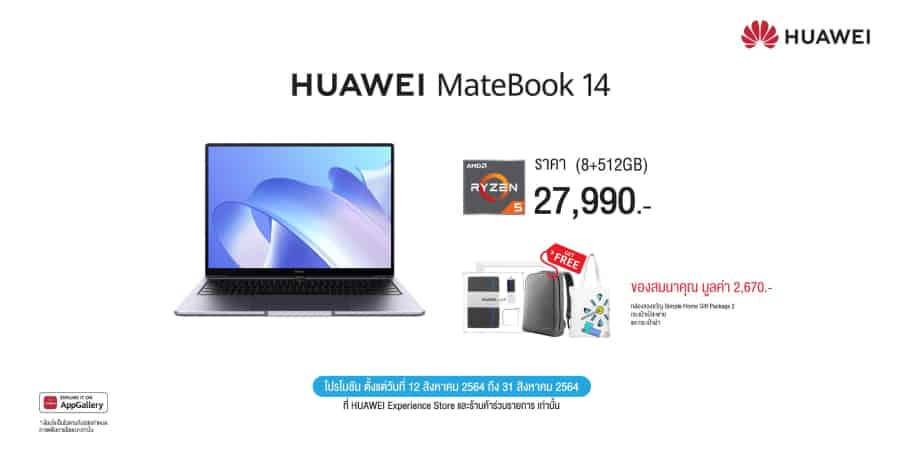ใครที่ปักหมุดแล้วว่าอยากจัดแล็ปท็อปใหม่เจ๋งๆ สักตัวมาประดับโต๊ะทำงาน เพื่อยกระดับประสิทธิภาพการทำงานให้ตอบโจทย์ยุค Work From Home แบบนี้ก็ลองพิจารณา HUAWEI MateBook 14 ไว้เป็นหนึ่งในตัวเลือกที่จะทำให้เรารอดพ้นสมรภูมิงานไปด้วยกัน โดยเฉพาะล่าสุดนี้ HUAWEI MateBook 14 ที่มากับชิปเซ็ต AMD R5 (รุ่น 8GB DDR4+512GB PCIe NVMe SSD) กำลังจัดโปรโมชันฉลองวันแม่ที่ผ่านมากับราคา 27,990 บาท รับฟรีของแถมสุดคุ้ม Simple Home Gift Package 2 (ประกอบด้วย สเปรย์อเนกประสงค์ ผ้าเช็ดทำความสะอาด สมุดโน้ต) มูลค่า 1,290 บาท กระเป๋าเป้สะพาย มูลค่า 1,090 บาท และกระเป๋าผ้า มูลค่า 290 บาท รวมมูลค่า 2,670 บาท เมื่อสั่งซื้อตั้งแต่วันที่ 12 สิงหาคม 2564 ถึง 31 สิงหาคม 2564 หรือสั่งซื้อออนไลน์ได้แล้ววันนี้ที่ HUAWEI Online Store และ Shopee รวมทั้งช่องทาง HUAWEI Experience Store และร้านค้าตัวแทนจำหน่ายที่ร่วมรายการ โดยสามารถเข้าไปดูรายละเอียดเพิ่มเติมเกี่ยวกับผลิตภัณฑ์ได้ที่นี่
