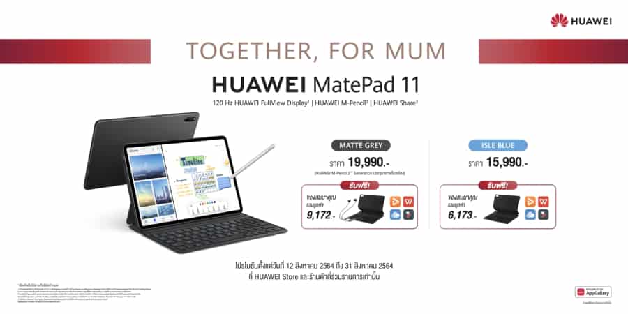 - HUAWEI MatePad 11 หน่วยความจำ 6GB + 128GB (รุ่น WiFi) สี Matte Grey พร้อม HUAWEI M-Pencil (2nd generation) บรรจุภายในกล่อง ในราคา 19,990 บาท รับของสมนาคุณสุดคุ้มเป็น HUAWEI Smart Magnetic Keyboard, HUAWEI FreeLace Pro, สิทธิพิเศษจากแอปฯ ต่างๆ ได้แก่ HUAWEI Cloud 1 เดือน (50GB), HUAWEI Video VIP 1 เดือน, WPS Office VIP 3 เดือน และ FilmoraGo HD VIP 3 เดือน มูลค่ารวม 9,172 บาท*