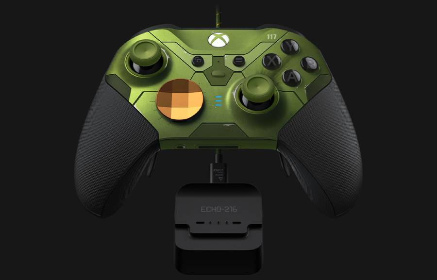 ส่วนตัวคอนโทรลเลอร์นั้นได้แรงบันดาลใจมาจากชุดเกราะสีเขียวของ Master Chief พร้อมกับปุ่ม D-Pad ในโทนสีทอง ที่ช่วยให้มันเข้ากับธีมเกมมากยิ่งขึ้น