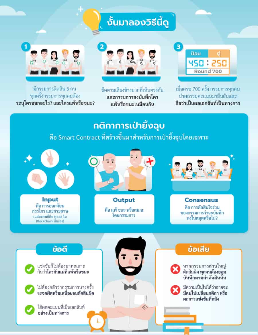 เมื่อนำมาเทียบเพื่อทำความเข้าใจกับบล็อกเชน กติกาการเป่ายิงฉุบก็คือ Smart contract ที่ทำมาสำหรับการเป่ายิงฉุบ โดยเฉพาะ input คือการออกค้อน กรรไกร กระดาษของ A และ B ส่วน output คือแพ้ ชนะ หรือเสมอ กรรมการแต่ละคนก็คือ Node ในบล็อกเชน เวลากรรมการจะมาตัดสินใจร่วมกันว่า จะบันทึกลงไปในสมุดของตัวเองหรือไม่ นั่นเรียกว่า consensus