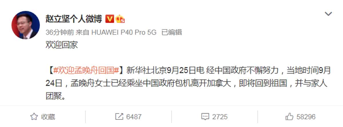 ทั้งนี้ ศาลแคนาดาได้ลงนามในคำสั่งให้ปล่อยตัว Meng Wanzhou พร้อมกับถอนคำสั่งส่งตัวผู้ร้ายข้ามแดนไปสหรัฐฯ และอนุญาตให้เธอสามารถเดินทางกลับจีนได้