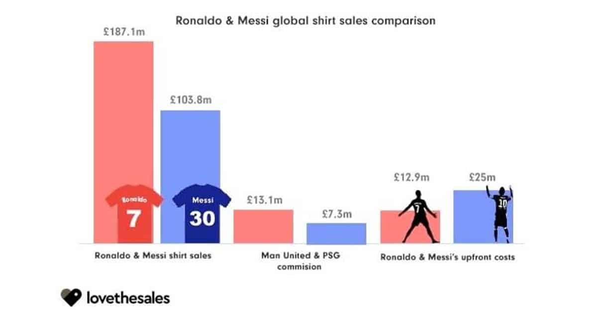 ความต้องการเสื้อทีม Paris Saint-Germain ของ Lionel Messi ว่าสูงแล้ว แต่ความต้องการซื้อเสื้อหมายเลข 7 ของ Cristiano Ronaldo นั้นสูงกว่าเกือบ 2 เท่าตัว