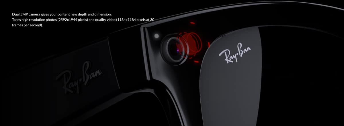 สเปคของแว่น Ray-Ban Stories นั้นมาพร้อมกับกล้อง 2 ตัวที่กรอบแว่นบริเวณหางตาทั้ง 2 ข้าง โดยกล้องมีความละเอียด 5 ล้านพิกเซล ผู้ใส่สามารถกดปุ่นเพื่อถ่ายภาพ / คลิปวิดีโอสั้นด้วยตัวเอง หรือใช้คำสั่งเสียงจาก Facebook Assistant
