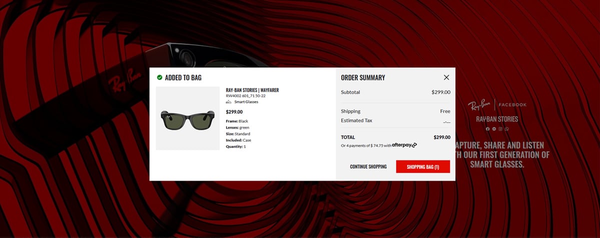 Facebook ตั้งราคาขาย แว่น Ray-Ban Stories ไว้ที่ 299 ดอลลาร์ หรือประมาณ 9800 บาท โดยจะวางขายใน 6 ประเทศ ได้แก่ สหรัฐอเมริกา , ออสเตรเลีย , ไอร์แลนด์ , อิตาลี และ สหราชอาณาจักร