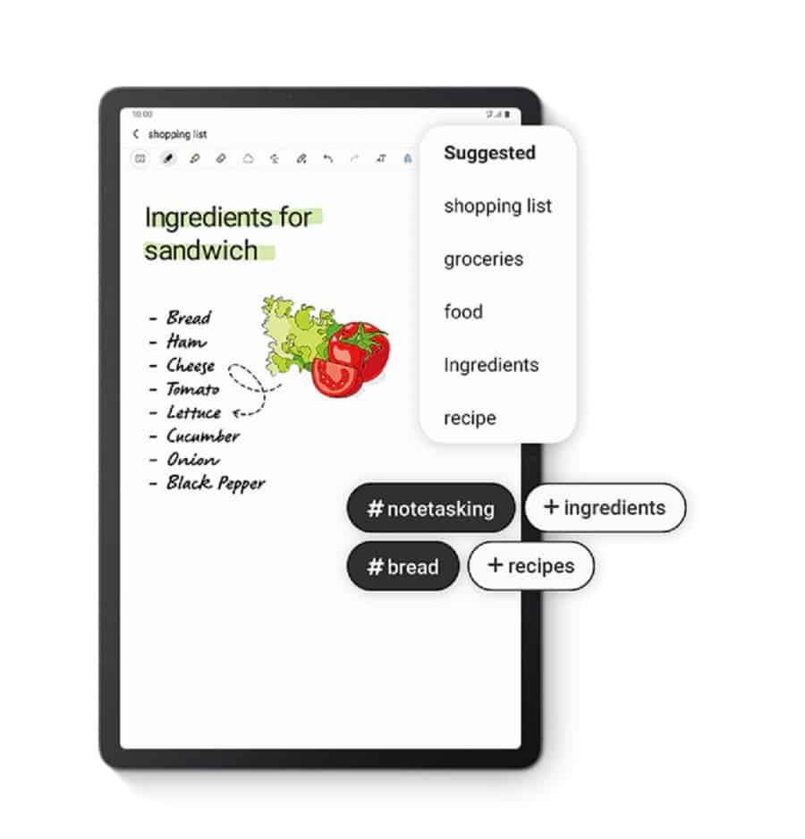 ยิ่งเทอมไหนเรียนเยอะ หลายวิชา มีเนื้อหาที่ต้องจดโน้ตมาก หากมี GalaxyTab S7 FE ก็ไม่ต้องกังวล เพราะสามารถจัดระเบียบโน้ตให้เป็นหมวดหมู่ได้ด้วยการตั้งชื่อหัวข้อ ติดแท็ก หรือใช้งาน Auto Title & Tags ให้กับโน้ตนั้นๆ เพื่อเก็บบันทึกโน้ตได้อย่างเป็นระเบียบและง่ายต่อการค้นหา และยังสามารถเขียนข้อความหรือ key word ลงบนแถบการค้นหาเพื่อใช้แทนการพิมพ์ได้อีกด้วย