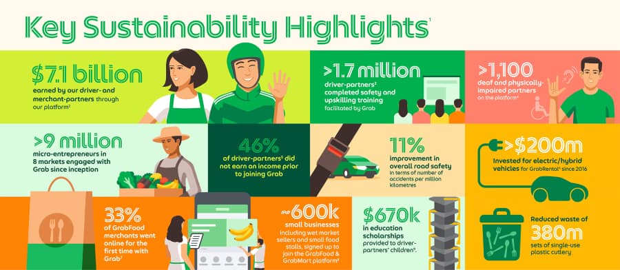 - พาร์ทเนอร์คนขับแกร็บกว่า 1.7 ล้านคนผ่านโปรแกรมการฝึกอบรมต่างๆ ของแกร็บ อาทิ ความรู้ด้านดิจิทัล การปกป้องข้อมูล ความรู้ทางการเงิน คอร์สสื่อสารภาษาอังกฤษ เป็นต้น