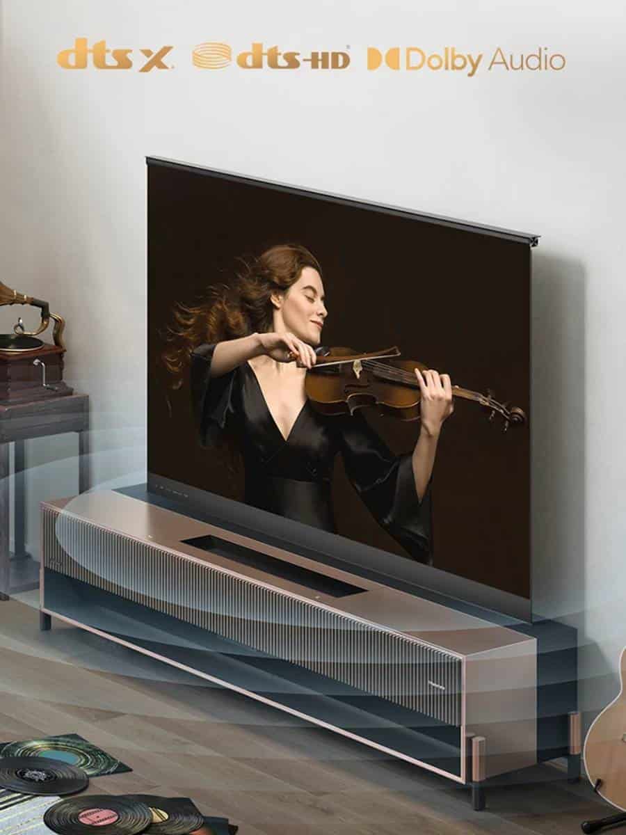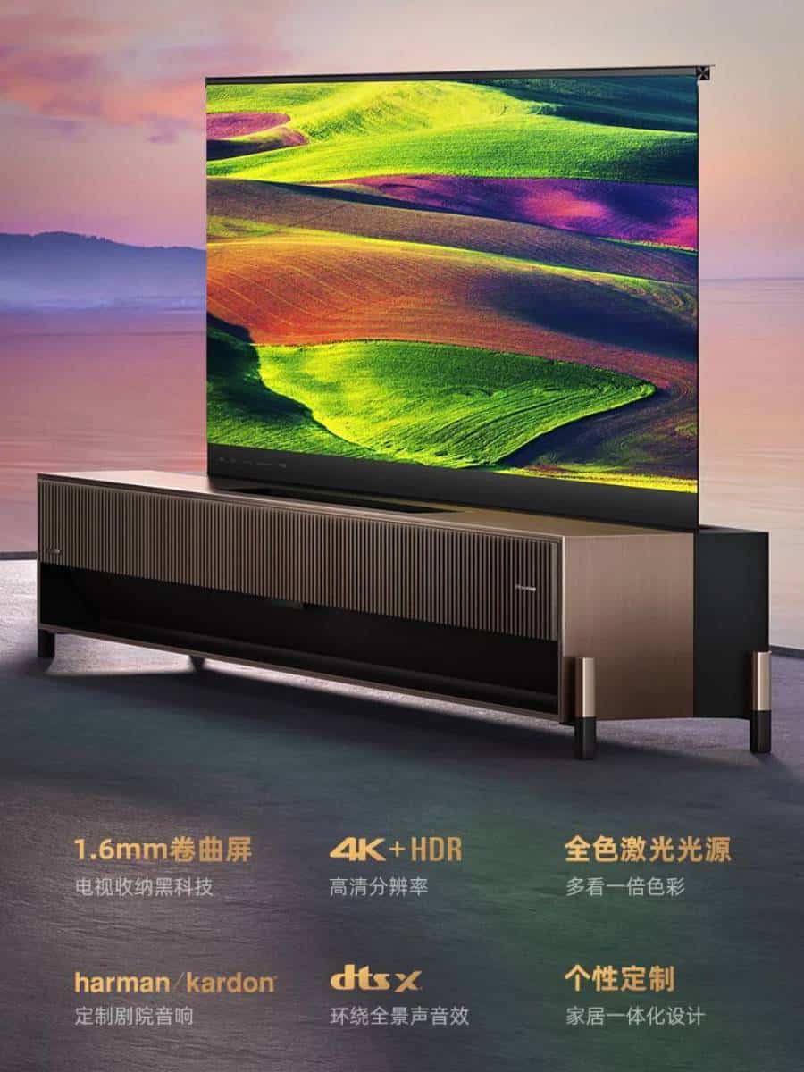 Hisense Rollable Screen Laser TV มีแผงหน้าจอขนาดใหญ่ 77 นิ้ว และขับเคลื่อนโดยเทคโนโลยีหน้าจอแบบม้วนได้ของบริษัทเอง รวมไปถึงเทคโนโลยีเลเซอร์สีเต็มรูปแบบ รองรับความละเอียด HDR ความละเอียดสูงพิเศษ 4K, ช่วงสีกว้างพิเศษ 107% BT.2020 และความสว่างสูงสุด 350nits