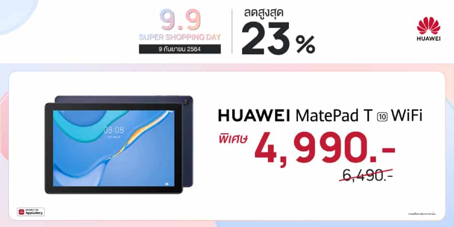 - HUAWEI MatePad T10 รุ่น WIFI แท็บเล็ตรุ่นประหยัดหน้าจอ HD ขนาด 9.7 นิ้ว พกพาง่าย รองรับเทคโนโลยีเสียง Huawei Histen 6.1 และฟีเจอร์สำหรับการเรียนรู้ขั้นพื้นฐานของลูกน้อย Kid’s Corner พร้อมฟังก์ชันครบเครื่องทั้ง App Multiplier แบ่งแอปได้ 2 หน้าจอ วิดีโอคอล MeeTime และส่งไฟล์ได้ผ่าน HUAWEI Share วางจำหน่ายในราคาพิเศษที่ 4,990 บาท จากราคาปกติ 6,490 บาท
