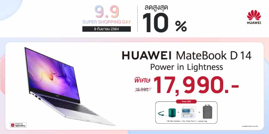 - HUAWEI MateBook D 14 แล็ปท็อปคุ้มค่าที่แนะนำแห่งปีวางจำหน่ายพร้อมขุมพลังชิปเซ็ต 10th Gen Intel Core i3 Processor จัดเต็มด้วยดีไซน์อลูมิเนียมบางเบาพกง่าย หน้าจอ HUAWEI FullView Display ขนาด 84% ของตัวเครื่อง ขั้นกว่าของ Multi-screen Collaboration ผ่าน HUAWEI Share 3.0 ที่แชร์จอสมาร์ทโฟนหัวเว่ยขึ้นบนจอแล็ปท็อปได้ถึง 3 แอปฯ พร้อมกัน รองรับการชาร์จ HUAWEI SuperCharge 65W ด้วยสายชาร์จ Type-C ที่เข้ากันได้กับหลากหลายอุปกรณ์ วางจำหน่ายในสี Mystic Silver ราคาพิเศษเฉพาะวันที่ 9 กันยายน 2564 ที่ 17,990 บาท จากราคาปกติ 19,990 บาท พร้อมรับฟรี HUAWEI CM Mini Speaker (มูลค่า 1,090 บาท) City Travel Pack 4 (มูลค่า 1,490 บาท) และกระเป๋าแล็ปท็อป (มูลค่า 1,090 บาท)