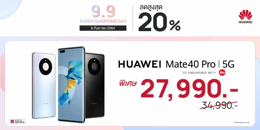 - HUAWEI Mate 40 Pro สมาร์ทโฟนเรือธงแห่งอนาคต ด้วยขุมพลังชิปเซ็ต 5G Soc ขนาด 5 นาโนเมตร ถ่ายวิดีโอเทียบชั้นภาพยนตร์ด้วยกล้อง Leica ซูมออปติคัลได้ที่ 5x และซูมดิจิทัลได้สูงสุดถึง 50x ผสานกับลูกเล่นอัจฉริยะมากมายจากระบบ AI เลนส์กล้องหลักความละเอียดสูงสุด 50MP ชาร์จไวเต็ม 100% ใน 50 นาที วางจำหน่ายในสี Mystic Silver ราคาพิเศษที่ 27,990 บาท จากราคาปกติ 34,990 บาท