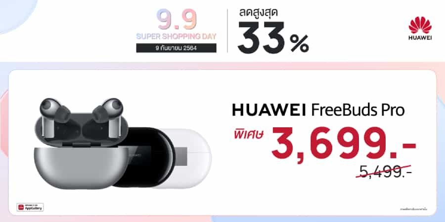 - HUAWEI FreeBuds Pro หูฟังตัวท็อปที่อัดแน่นด้วย เทคโนโลยี Active Noise Cancellation ตัดเสียงรบกวนได้สูงสุดถึง 40 เดซิเบล ไมโครโฟน 3 ตัว และรุ่นแรกของหูฟัง TWS ที่ใช้เสารับสัญญาณคู่ Dual Bluetooth Antenna วางจำหน่ายในราคาพิเศษที่ 3,699 บาท จากราคาปกติ 5,499 บาท