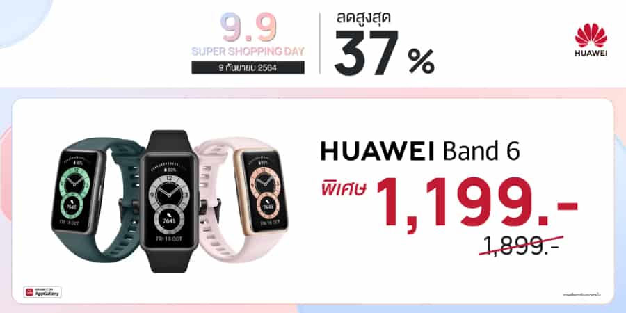 - HUAWEI Band 6 สมาร์ทแบนด์อัจฉริยะพร้อมหน้าจอ AMOLED FullView display 1.47 นิ้ว ดีไซน์และฟีเจอร์โดนใจทั้งสายสุขภาพ และกีฬา ด้วยโหมดออกกำลังกายที่ถึง 96 โหมด แบตเตอรี่ที่อยู่ได้นานถึง 14 วัน บวกกับการรองรับการชาร์จไว วางจำหน่ายในราคาพิเศษที่ 1,199 บาท จากราคาปกติ 1,899 บาท พร้อมรับฟรี สายนาฬิกา Band 6 มูลค่า 399 บาท (ของแถมยกเว้นการซื้อ HUAWEI Band 6 ราคาพิเศษใน Flash Sale)