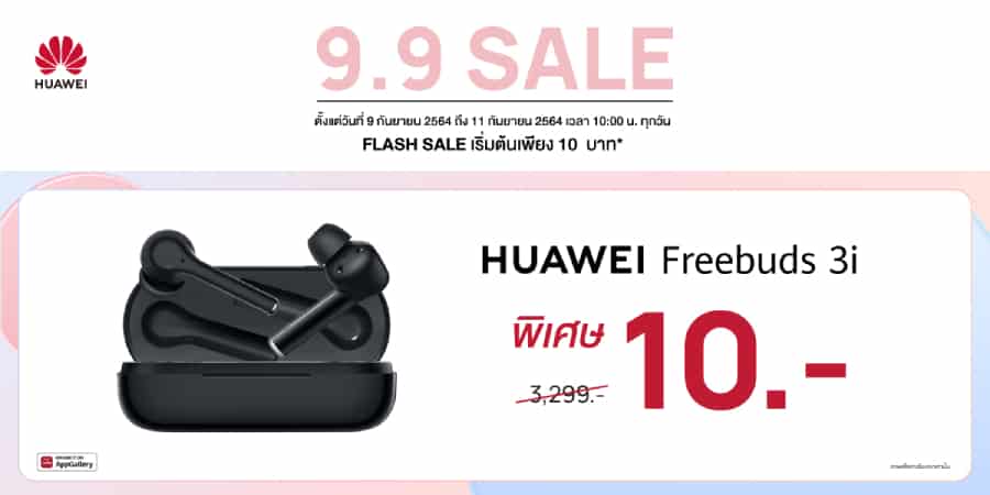 วอร์มนิ้วให้พร้อมเตรียมกดรับดีล กับโอกาสในการเป็นเจ้าของ HUAWEI FreeBuds 3i หูฟังไร้สายพร้อม Active Noise Cancellation และ Triple-mic Call Noise Reduction ใช้งานได้ต่อเนื่อง 15 ชั่วโมง ในราคาคุ้มเกินคุ้มแบบสุดเซอร์ไพรซ์กับ Flash Sale เริ่มต้นเพียง 10 บาท ทุกเช้าเวลา 10 โมงตรง ของวันที่ 9 กันยายน 2564 ถึง 11 กันยายน 2564 ที่ Huawei Online Store เท่านั้น!