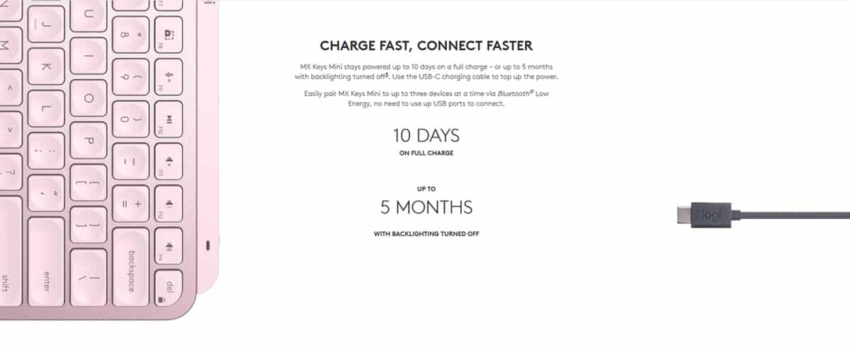 การทำงานยังทำได้เหมือนกับ MX Keys รุ่นปกติ โดยมาพร้อมกับไฟแบ็คไลท์ ส่วนเรื่องอายุการใช้งานแบตเตอรี่นั้น MX Keys Mini สามารถใช้งานต่อเนื่องได้สูงสุด 10 วันจากการชาร์จเต็ม 1 ครั้งเมื่อเปิดใช้งานไฟแบ็คไลท์ แต่ถ้าปิดใช้งานไฟแบ็คไลท์ จะสามารถใช้งานได้ยาวนานขึ้นสูงสุดถึง 5 เดือน คีย์บอร์ดสามารถชาร์จไฟผ่าน USB-C ได้ สลับใช้งานกับอุปกรณ์อื่นๆ ผ่านการเชื่อมต่อ Bluetooth ได้สูงสุด 3 อุปกรณ์