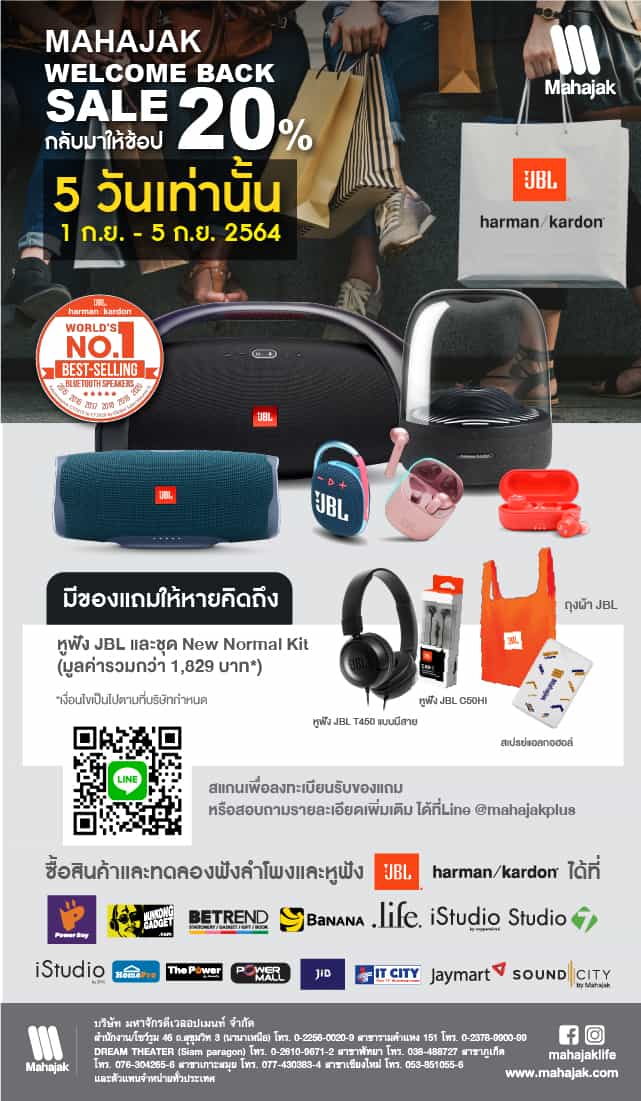 บริษัท มหาจักรดีเวลอปเมนท์ จำกัด จัดแคมเปญ MAHAJAK WELCOME BACK SALE ฉลองเปิดห้างลดราคาจัดหนัก 5 วันเท่านั้น!! สินค้าลำโพง หูฟัง ทั้ง JBL, HARMAN KARDON สินค้าหูฟังและลำโพงเกมมิ่ง JBL Quantum ลดราคา 20% เฉพาะสินค้าที่ร่วมรายการ รับฟรี!!ของแถมสุดพิเศษ หูฟัง JBL และชุด New Normal Kit มูลค่ารวมกว่า 1,829 บาท โดยมีรายละเอียดโปรโมชั่นดังนี้