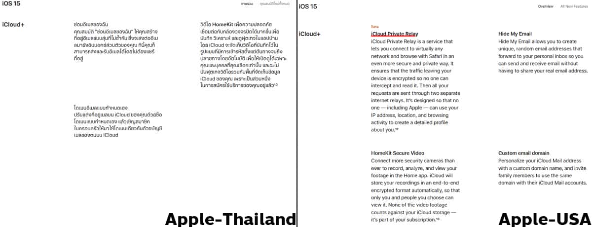 เมื่อเข้าไปดูหน้าอธิบายคุณสมบัติใหม่ที่มีใน iOS 15 ของ Apple-ประเทศไทย จะไม่เห็นฟีเจอร์ Private Relay ในคำอธิบาย ต่างจากประเทศที่เปิดใช้งานได้อย่างเช่น สหรัฐอเมริกา ที่ยังพบคำอธิบายของ Private Relay อยู่ในหน้าคำอธิบายคุณสมบัติใหม่ที่มีใน iOS 15