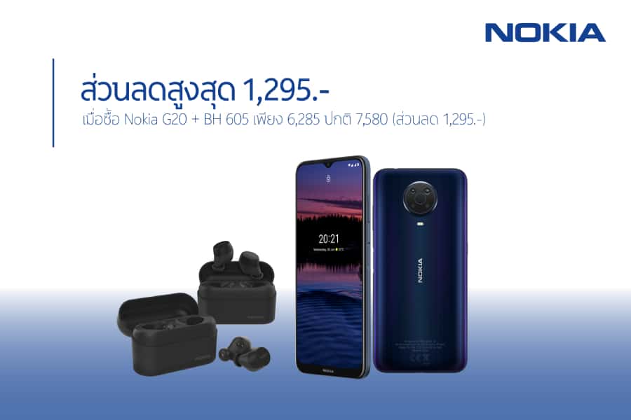 - สมาร์ทโฟน Nokia G20 พร้อมหูฟังไร้สาย Nokia Power Earbuds BH-605 (Polar Night Black สีเทาดำ) เพียง 6,285 บาท จากราคาปกติ 7,580 บาท (รับส่วนลด 1,295 บาท)