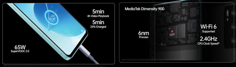 หมดกังวลเรื่องการใช้งานตลอดวัน ไม่ว่าจะเล่นเกมหรือเล่นโซเชียล มาพร้อมแบตเตอรี่ขนาด 4300mAh และเทคโนโลยีชาร์จเร็ว 65W SuperVOOC 2.0 ทำให้สามารถชาร์จแบตได้เต็ม 100% ภายใน 28 นาที และเพียงชาร์จแค่ 5 นาที ก็สามารถดูวิดีโอได้นานถึง 4 ชั่วโมง พร้อมให้ลุยทุกคอนเทนท์บนโลกออนไลน์ด้วยขุมพลังสุดแรง MediaTek Dimensity 900 Integrated 5G SoC ที่รองรับการเชื่อมต่อ 5G นอกจากนี้ด้วย RAM 8GM, ROM 128GB ที่มาพร้อมเทคโนโลยี RAM Expansion ช่วยแก้ปัญหาเมื่อโทรศัพท์กำลังขาด RAM ในการใช้งานเมื่อเปิดหลายแอปฯ พร้อมกัน โดยเลือกแปลงส่วนหนึ่งของ ROM ที่มีอยู่มาเป็นหน่วยความจำเสมือนแบบอัตโนมัติเพื่อประสบการณ์การใช้งานที่ลื่นไหลที่สุด