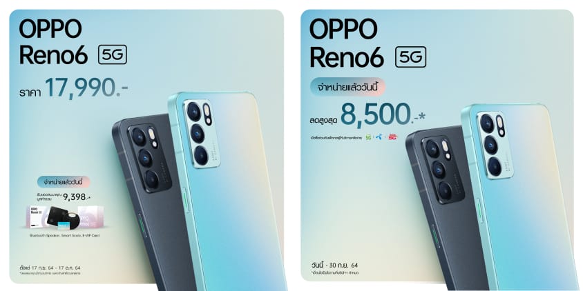 ที่มาพร้อมกับเทคนิค Reno Glow ที่ให้ความเปล่งประกายสวยสะดุดตาอันเป็นเอกลักษณ์ของออปโป้ เทคโนโลยีชาร์จเร็ว 65W SuperVOOC 2.0 และรองรับการเชื่อมต่อ 5G ให้ใช้งานในชีวิตประจำวันได้อย่างเร็วแรง ในราคา 17,990 บาท พิเศษสำหรับผู้ที่ซื้อ OPPO Reno6 5G ในวันที่ 17 กันยายน จนถึง 17 ตุลาคมนี้ รับเซ็ตของพรีเมี่ยมสุดพิเศษมูลค่ารวม 9,398 บาท (จำนวนจำกัด) ณ OPPO Brand Shop ทุกสาขา และตัวแทนจำหน่ายทั่วประเทศ และอีกหนึ่งช่องทางพิเศษเมื่อจองผ่านผู้ให้บริการเครือข่าย รับส่วนลดสูงสุดถึง 8,500 บาท ตั้งแต่วันนี้ จนถึง 30 กันยายนนี้เท่านั้น