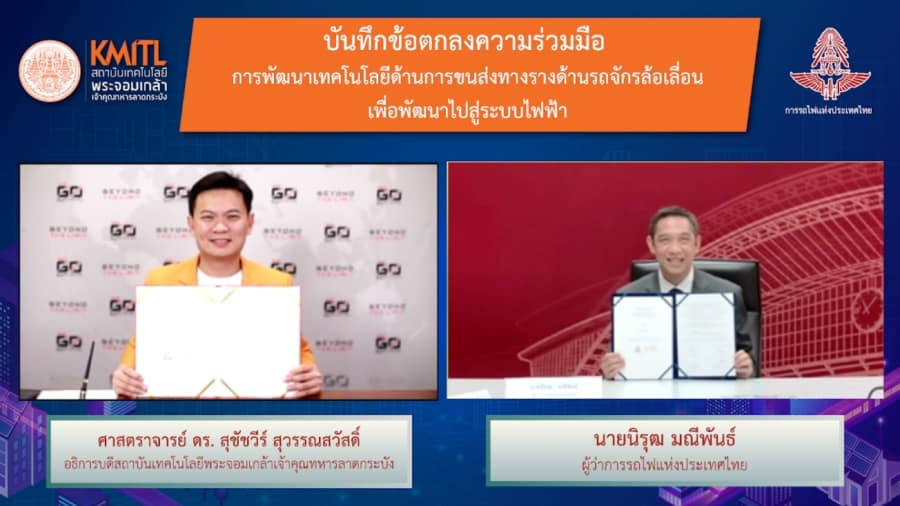 สำหรับการลงนามบันทึกข้อตกลงความร่วมมือ “การพัฒนาเทคโนโลยีด้านการขนส่งทางรางด้านรถจักรล้อเลื่อน เพื่อพัฒนาไปสู่ระบบไฟฟ้า” จัดขึ้นเมื่อเร็ว ๆ นี้ ผ่านแพลตฟอร์มวิดีโอคอลในระบบซูม (Zoom) ติดตามความเคลื่อนไหวกิจกรรมของ สจล. ผ่าน www.facebook.com/kmitlofficial และ www.kmitl.ac.th