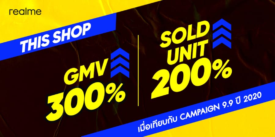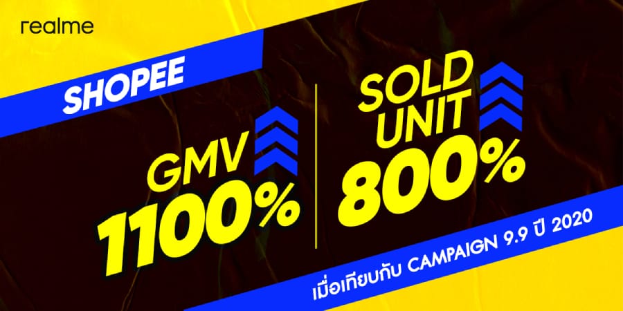 เริ่มจากช่องทาง Shopee realme ประสบความสำเร็จต่อเนื่องด้วยการติดอันดับ 3 แบรนด์ขายดี ในหมวดมือถือและแท็บเล็ต โดยมียอดต่อเครื่องโตกว่า 800% และยังมีมูลค่ายอดขายรวมโตกว่า 1100% อยู่ในอันดับที่ 5