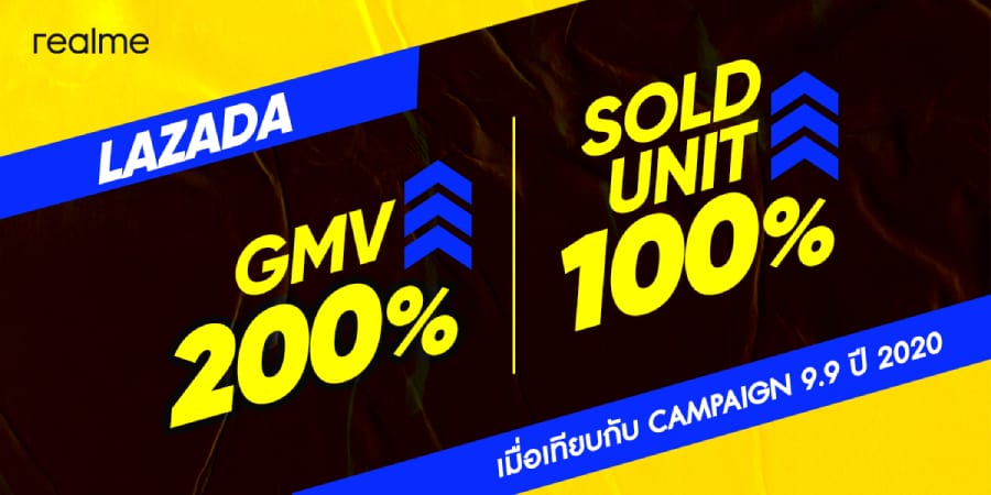 กวาดยอดขายพุ่งในช่วงแคมเปญ realme 9.9 SUPER SALE โดยมีมูลค่ายอดขายเฉลี่ยรวมโตกว่า 100% ใน 4 ช่องทาง e-Commerce ยักษ์ใหญ่ของไทย