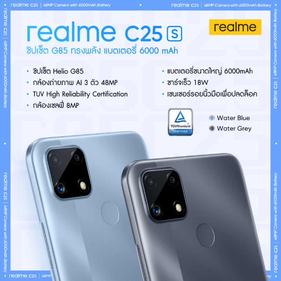 realme C25s จัดเต็มใน ราคา สุดคุ้มให้คุณเก็บทุกความประทับใจอย่างแจ่มชัดด้วย AI Triple Camera ความละเอียด 48MP พร้อมโหมด Super Nightscape จุใจกับแบตเตอรี่ขนาดใหญ่ 6000 มิลลิแอมป์ และการแสดงผลระดับ HD+ mini-drop Fullscreen บนหน้าจอ 6.5 นิ้ว ขับเคลื่อนด้วยชิปเซ็ต Helio G85 12nm Octa-core ความเร็ว 2.0GHz