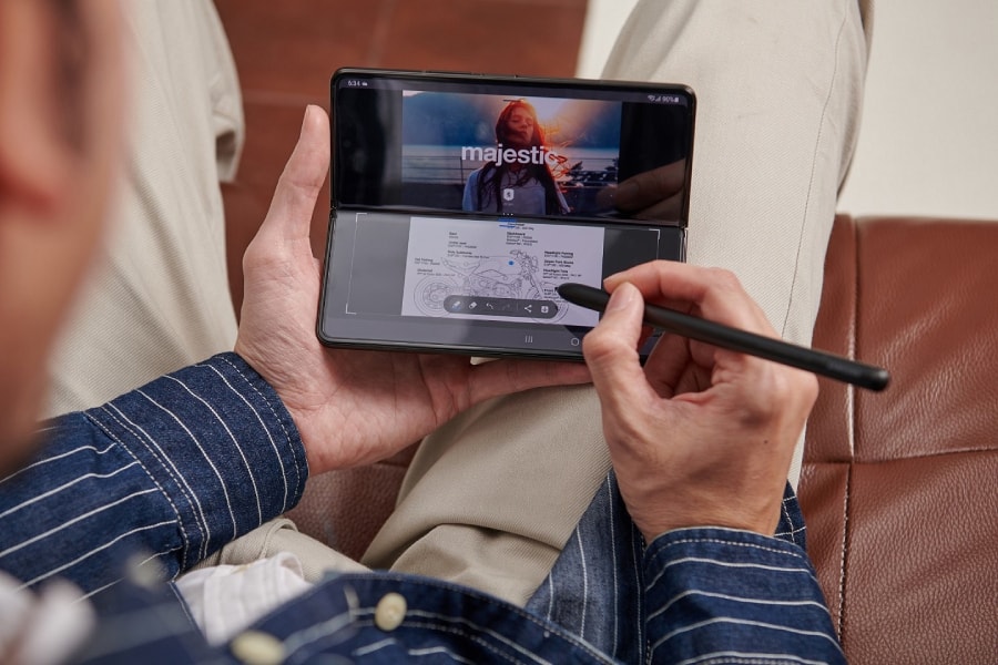 S Pen ถือเป็นหนึ่งในเครื่องมือชิ้นสำคัญของคนทำงาน ด้วยประสิทธิภาพของการเขียนที่แม่นยำ ความอเนกประสงค์ด้านการใช้งาน รวมถึงขนาดที่ง่ายต่อการพกพา ซึ่งเมื่อนำมารวมกับความโดดเด่นของสมาร์ทโฟนหน้าจอพับได้ ที่มาพร้อมหน้าจอขนาดใหญ่ 7.6 นิ้ว ทำให้สามารถเพิ่มขอบเขตการใช้งาน S Pen ให้ทรงพลังยิ่งขึ้น