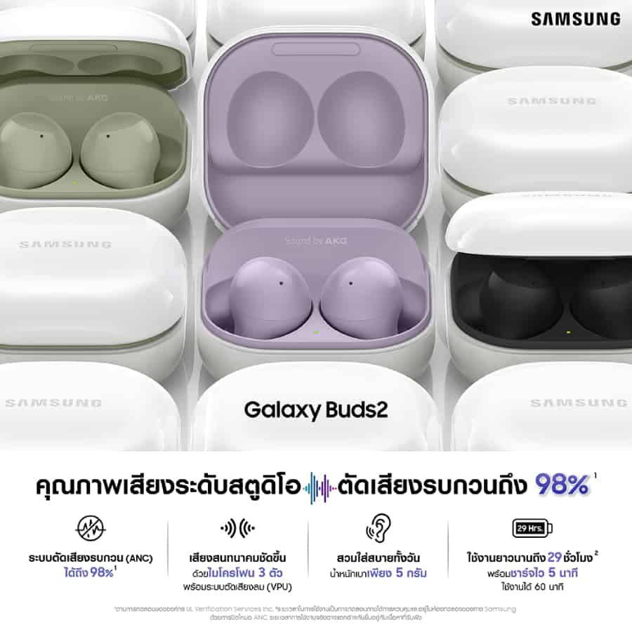 Galaxy Buds2 หูฟังไร้สายที่มีขนาดเล็กและน้ำหนักเบาที่สุดเพียงแค่ 5 กรัม ซึ่งมาพร้อมกับดีไซน์โค้งมนอันเป็นเอกลักษณ์ที่ได้รับการออกแบบมาเพื่อมอบความสบายให้กับผู้ใส่ รวมถึงยังสามารถทำงานและเชื่อมต่อกับสมาร์ทโฟน แท็บเล็ต และสมาร์ทวอทช์ในอีโคซิสเต็มของซัมซุงกาแลคซี่ได้เป็นอย่างดี ไม่ว่าจะเป็นการฟังเพลง โทรศัพท์ หรือประชุมออนไลน์ โดย Galaxy Buds2 มอบเสียงคมชัด เบสนุ่มลึกและเสียงสูงที่ชัดเจนด้วยลำโพงไดนามิกระบบ 2 ทิศทาง พร้อม Active Noise Canceling ที่ช่วยตัดเสียงรบกวนภายนอกได้สูงสุดถึง 98% ในขณะเดียวกัน หากต้องการได้ยินเสียงบรรยากาศโดยรอบ ก็สามารถเลือกปรับ Ambient Sound ได้ถึง 3 ระดับ พร้อมสามารถใช้งานได้ยาวนานถึง 29 ชั่วโมง และชาร์จไว 5 นาที ก็ใช้งานได้นานถึง 60 นาที โดยวางจำหน่ายในราคา 3,990 บาท ในตัวเลือก 3 สี ได้แก่ Graphite , Olive และ Lavender พร้อมด้วยอุปกรณ์เสริมสุดเก๋อีกมากมาย