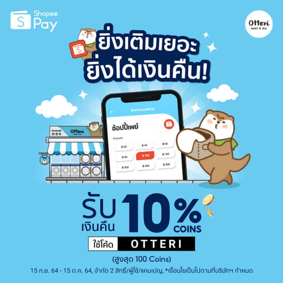 พิเศษ! เพียงเข้าแอปพลิเคชัน Otteri และเลือกเติมเงินด้วย ShopeePay ในจำนวนที่ต้องการ พร้อมกรอกโค้ด OTTERI ก็สามารถรับสิทธิพิเศษ Shopee Coins Cashback 10% สูงสุด 100 Coins ทันที โดยโค้ดสามารถใช้ได้ตั้งแต่วันที่ 15 กันยายน – 15 ตุลาคมนี้เท่านั้น ติดตามรายละเอียดเพิ่มเติมได้ที่https://www.facebook.com/ShopeePayTH