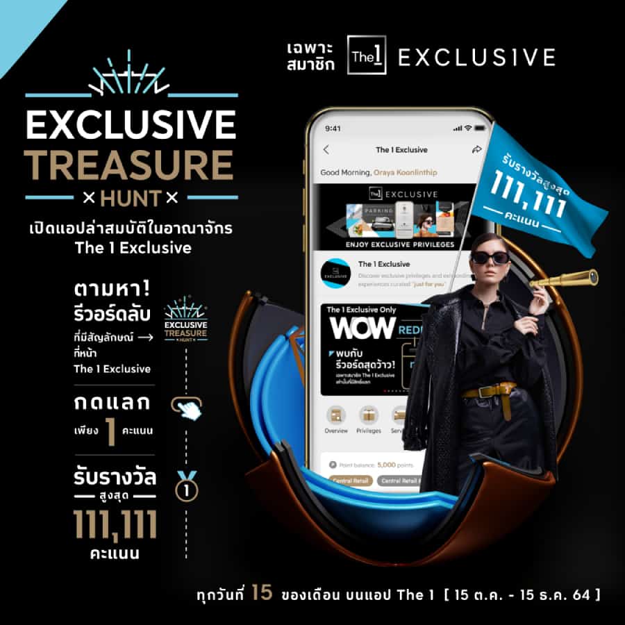 The 1 (เดอะ วัน) ผู้นำดิจิทัลไลฟ์สไตล์และลอยัลตี้แพลตฟอร์มอันดับ 1 ของไทย ภายใต้กลุ่มเซ็นทรัล เดินหน้ายกระดับที่สุดแห่งประสบการณ์เอ็กซ์คลูซีฟให้กับ The 1 Exclusive โปรแกรมดูแลสมาชิกคนพิเศษที่เหมาะกับไลฟ์สไตล์คนยุคใหม่ ตอกย้ำความสะดวกสบายสูงสุด เปิดตัวหน้า The 1 Exclusive ศูนย์รวมทุกบริการและสิทธิประโยชน์เฉพาะสำหรับสมาชิก The 1 Exclusive บน แอป The 1 เท่านั้น พร้อมจัดเต็มหลากหลายโปรโมชั่นพิเศษกว่าใครในทุกๆ เดือน ล่าสุดส่งกิจกรรมโปรโมชั่น Exclusive Treasure Hunt ที่ทั้งสนุกสนานและมอบที่สุดแห่งความคุ้มค่า แลกเพียง 1 คะแนน รับคืนสูงสุดถึง 111,111 คะแนน