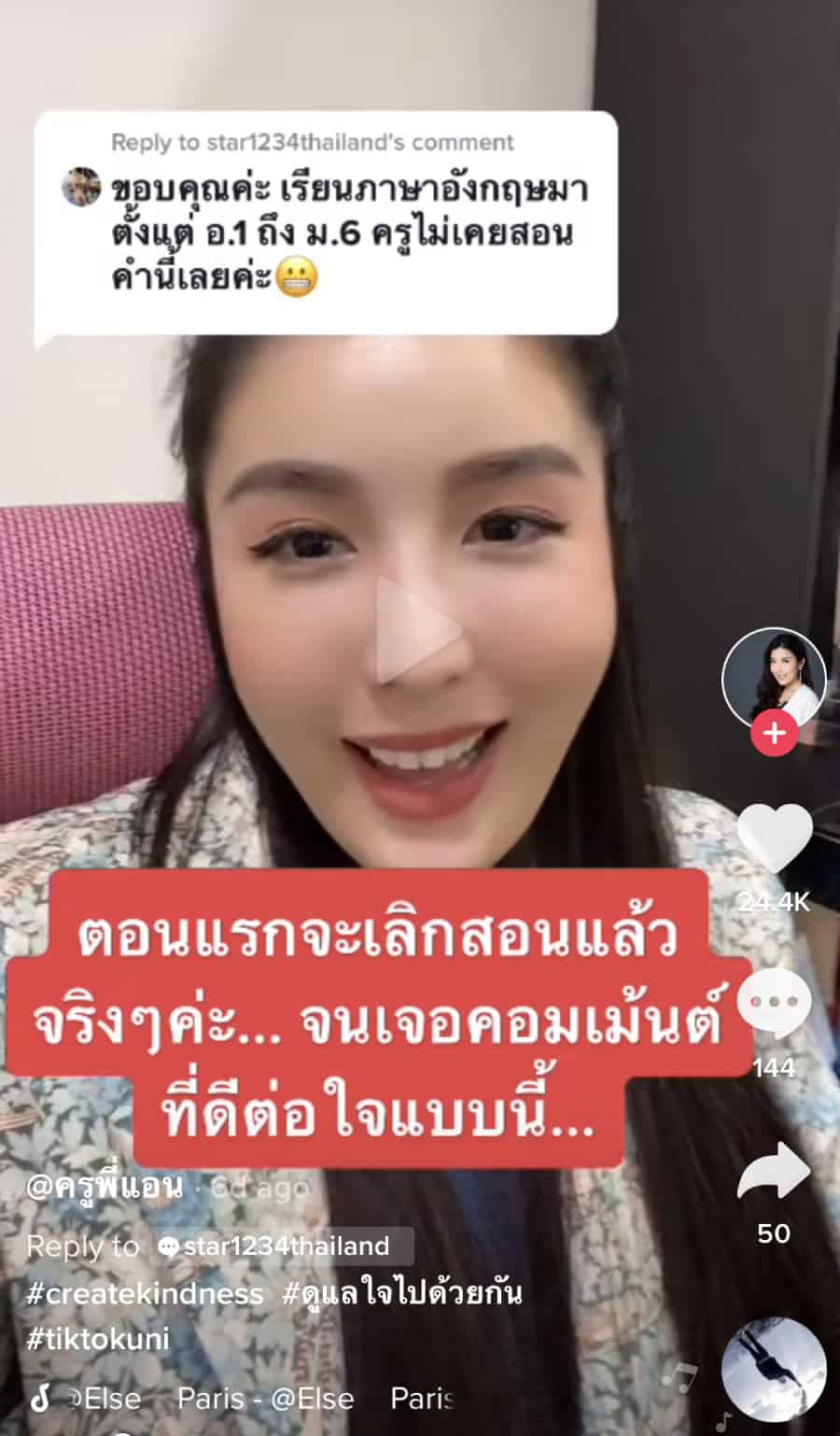ครูพี่แอน @krupann.english ครีเอเตอร์สายการศึกษาที่มาแรง ได้รับคัดเลือกเป็นตัวแทนครีเอเตอร์คนไทยร่วมแคมเปญของภูมิภาคเอเชียตะวันออกเฉียงใต้ และได้ร่วมแคมเปญในประเทศไทย เพื่อร่วมนำเสนอ คอมเมนต์นี้ดีต่อใจ โดยได้ถ่ายทอดประสบการณ์จากการสอนภาษาอังกฤษ ที่ได้ใช้แนวทางการสอนในเรื่องการเลือกใช้ภาษาให้สุภาพและเป็นมืออาชีพ จึงทำให้หลายคนไม่พอใจในการสอน และให้คอมเมนต์ว่าจะทำให้คนไทยเสียความมั่นใจในการพูด ส่งผลกระทบในการเสียความมั่นใจไป แต่เมื่อมาทบทวนคอนเทนท์ และการได้คอมเมนต์ที่ดีต่อใจ ทั้งการมีคนเชื่อมั่นในตัวเราและมีคอมเมนต์ที่ดีๆ ต่อเนื่อง ทำให้แรงขับเคลื่อนสร้างคอนเทนท์ที่มีประโยชน์อย่างต่อเนื่อง