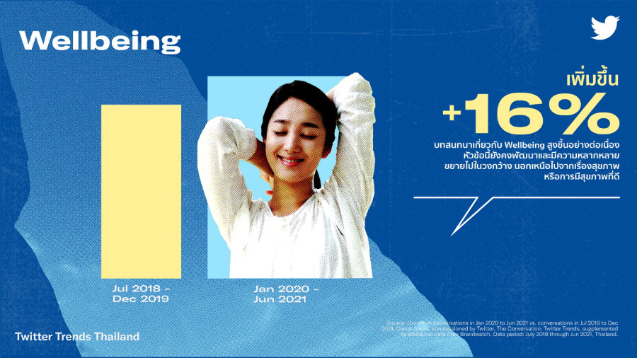 ชาวทวิตภพจะไม่ปล่อยให้ตัวเองอยู่ในสภาพเดิมๆ และ “ปล่อยชีวิตให้ผ่านไป” แบบง่ายๆ อีกต่อไปแล้ว บทสนทนาเกี่ยวกับ Wellbeing หรือ การมีชีวิตที่ดีเพิ่มขึ้น 16% แสดงให้เห็นว่าหัวข้อนี้แสดงถึงการที่คนไทยกำลังให้ความสำคัญในเรื่องของการเชื่อมต่อระหว่างสุขภาพกายและสุขภาพใจมากยิ่งขึ้น โดยเฉพาะเรื่องของสุขภาพจิตที่เป็นเรื่องที่ชาวทวิตภพให้ความสำคัญมากขึ้น และได้มีการพูดถึงโดยทั่วไปอย่างกว้างขวางมากขึ้น