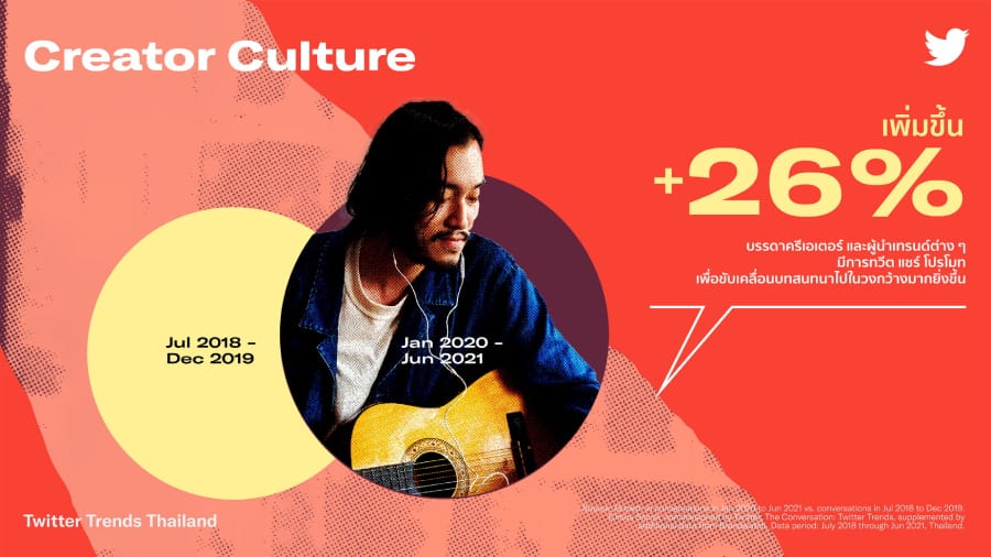 ทวิตเตอร์ได้วิเคราะห์ทวีตใน 3 ปีที่ผ่านมา (ก.ค. 2018 – มิ.ย. 2021) และได้เจาะลึกลงไปในบทสนทนาของทวิตเตอร์ประเทศไทยว่า พวกเขาคือใคร มีพฤติกรรมเปลี่ยนไปอย่างไร เทรนด์ที่กำลังมาแรงคืออะไร ซึ่งได้จัดทำเป็นรายงานข้อมูลเชิงลึกขึ้นชื่อว่า Thailand TwitterTrends Report 2021 โดยจากการศึกษาพบว่า มี 6 กลุ่มหัวข้อสนทนาที่กำลังเป็นที่นิยมและกำหนดทิศทางอนาคต คือ Wellbeing, Creator Culture, Everyday Wonder, One Planet, Tech Life และ My Identity ซึ่งเราทราบดีว่าแบรนด์ที่มีความเกี่ยวข้องกับวัฒนธรรมเหล่านี้สามารถแสดงศักยภาพของแบรนด์ออกมาได้เป็นอย่างดีและประสบความสำเร็จมากที่สุด ข้อมูลเชิงลึกเหล่านี้จึงมีประโยชน์กับนักการตลาดและแบรนด์ต่างๆ ที่กำลังมองหาวิธีเอ็นเกจและสร้างความเชื่อมโยงกับกลุ่มเป้าหมายของพวกเขาได้ดียิ่งขี้น