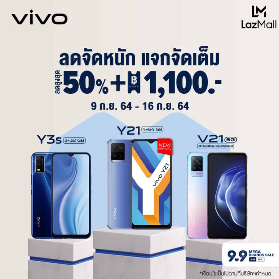 สำหรับแพลตฟอร์ม Lazada เตรียมลดแบบจัดหนัก แจกแบบจัดเต็มไม่แพ้กัน กับ Lazada 9.9 Mega sale แคมเปญแห่งปี ที่รอบนี้ทาง vivo ขนโปรโมชันสุดพิเศษ ลดคุ้มเกินราคา สูงถึง 50% ทั้งสมาร์ตโฟน และ อุปกรณ์ accessories พร้อมคูปองส่วนลดให้เก็บเพิ่มอีกถึง 1,100 บาท ถ้าไม่อยากพลาด เตรียมตั้งนาฬิกาปลุกไว้ได้เลย เพราะจำกัดเพียงแค่ 2 ชั่วโมงเท่านั้น ตั้งแต่เวลา 00.00 – 02.00 น. ของวันที่ 9 กันยายน 2564 พร้อมพบกับสมาร์ตโฟนรุ่นสุดฮิตของ vivo ขนทัพกันมาลดราคาสนั่น ไม่ว่าจะเป็น
