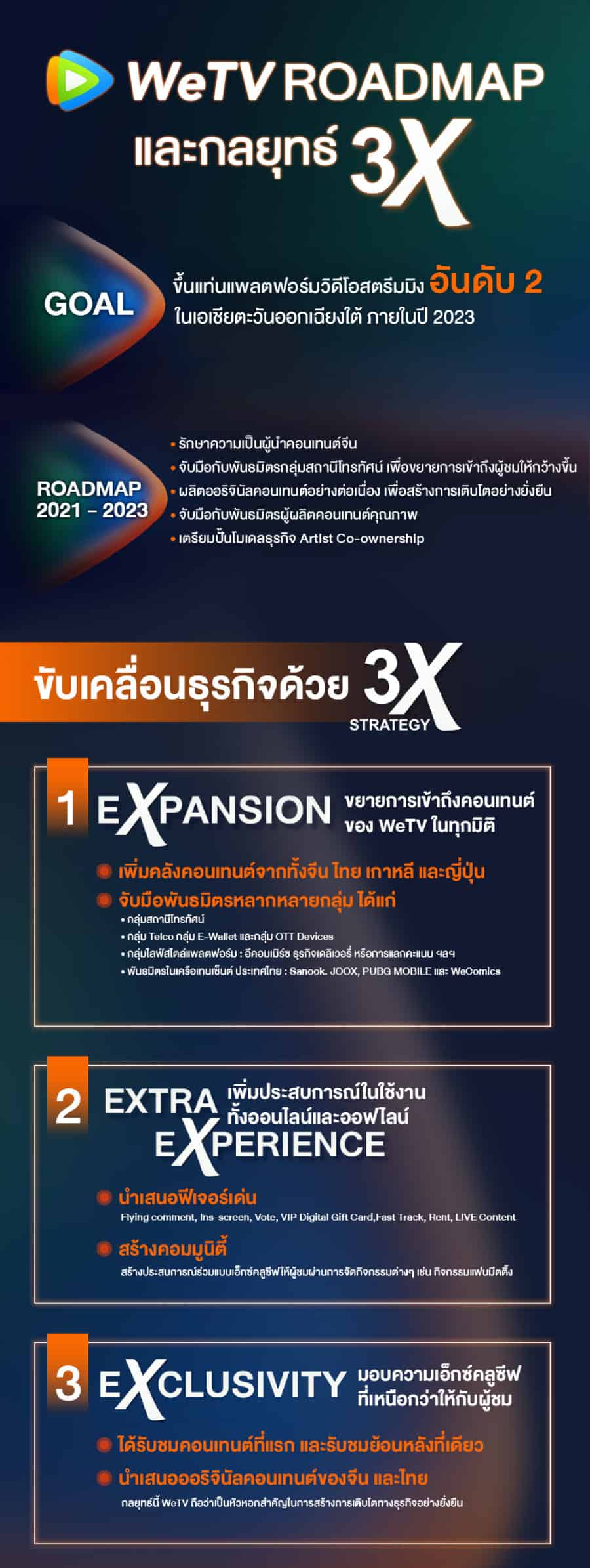 เพื่อสานต่อความสำเร็จดังกล่าว WeTV ประเทศไทยได้วางแนวทางการดำเนินงานในปี 2021-2023 ภายใต้กลยุทธ์ “3X” เป็นอาวุธสำคัญในการขับเคลื่อนธุรกิจเพื่อสร้างการเติบโตต่อจากนี้